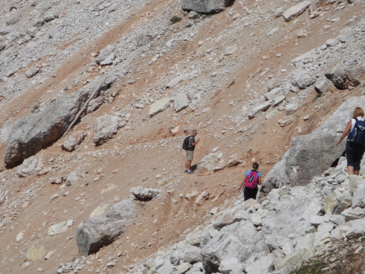 ザレ斜面の勾配が急になり、トレールも細くなるスリリングな場所があります。細いトレールで、珍しくトレッカーに出会いました。お互い譲りながらこのスリリングな場所を通過します。