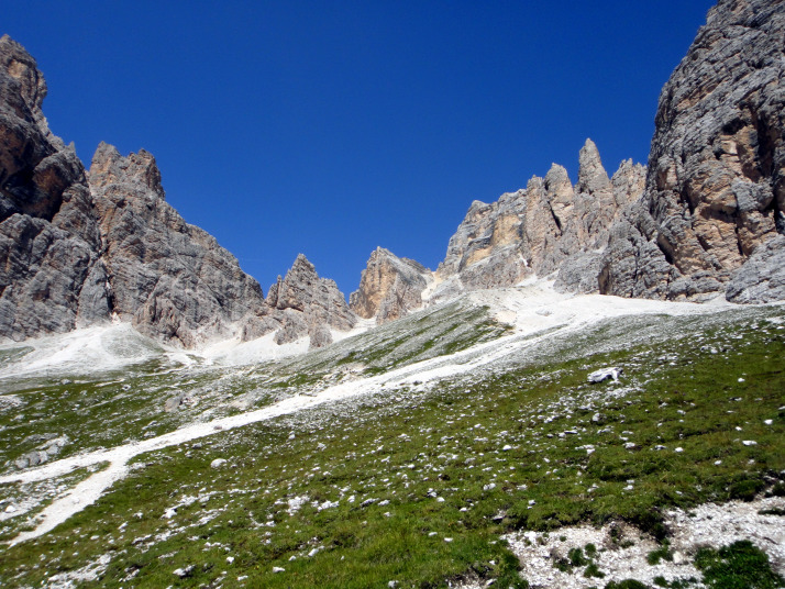 左側、奥の頂きはソラピス(Punta Sorapis 3205m)、その右端はアンテラオ(Monte Antelao 3263m)です。
