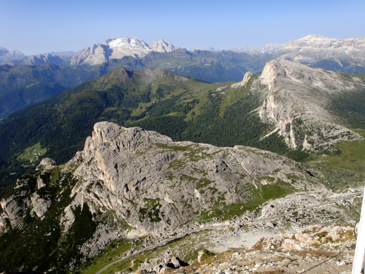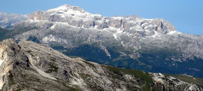 巨大な尖塔を持つ名峰チベッタ山(Monte Civetta3218m)が南方向に遠くかすんで見えます。 |