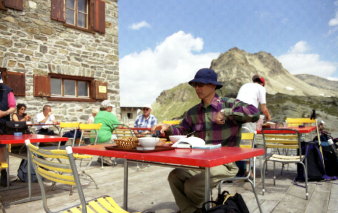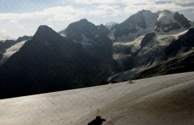 右の氷河は、ロゼック氷河(Vadret da Roseg 3920m)と呼ばれておりこの氷河は、これからトレッキングするロゼック谷に流れ、ポント・レジーナ(Pontresina)に至ります。 |