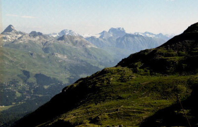 この写真は、中間駅Murtel駅付近からのシルヴァプラーナ方向の景色です。