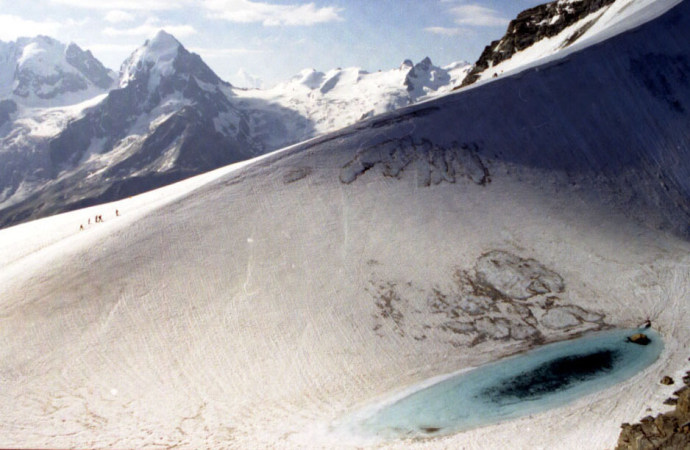 ここからは、ピッツ・ロゼック、ピッツ・シェルシェン、ピッツ・ベルニナが一望出来ます。P.Bernina(4049m)から流れ出すチ