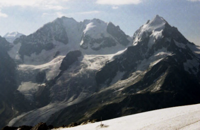 右から三角錐の山がピッツ・ロゼックその隣後方に、ピツツ・シエルセン(Piz.Scerscen3895m)そしてピッツ・ベルニナ(P.Bernina)(4049m)と続きます。