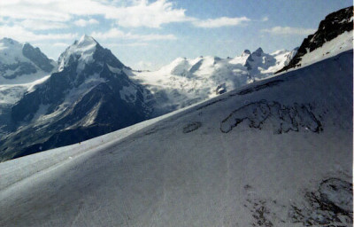 ガレ場をトラバースし、一登りすると急に眺望が開け、ロゼック谷を隔てベルニナ山群が忽然と姿を現わします。ベルニナ山群の核心部が見えて来ます。