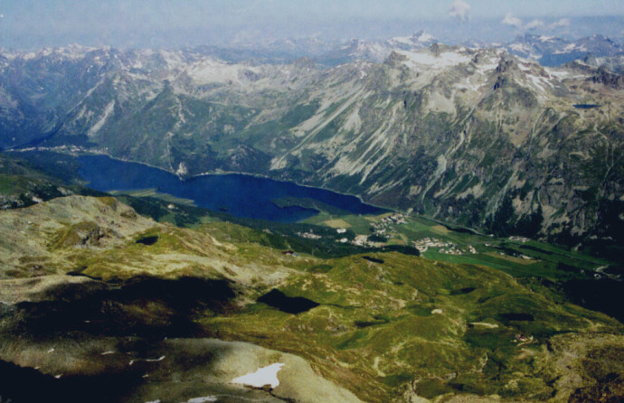 ゴルヴァッチュ(P.Corvatsch 3,297m)展望台より北側シルヴァプラーナ湖(silvaplanasee)の眺望。