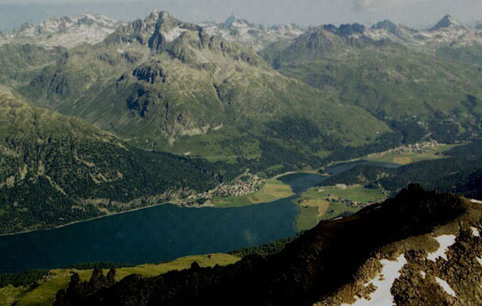 シルス(Sgel)湖を北西(画面左)の方向に上って行くと、マロヤ(Maloya)峠があります。峠を超すとブルガリア峡谷(Val Bregaglia)です。ブルガリア峡谷は、中世の面影を残した村ソーリオ(Soglio)があります。 |