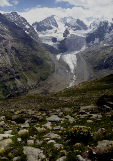3,937m)、ピッツ・ロゼック(Piz Roseg 3,937m)、(この三山をベルニナ三山と呼ぶそうです)の間より流れ出る氷河チエルヴァ氷河(Vadret