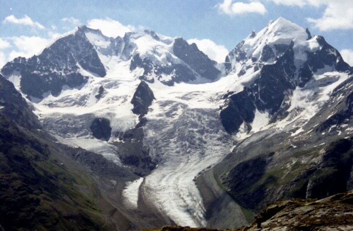 Roseg 3,937m)。流れ出すチエルヴァ氷河。